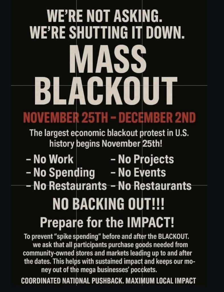 A coordinated economic blackout is set for November 25th, 2025 to December 2nd, 2025 (#masseconomicblackout). Americans are urged to refrain from spending money during this time as a demonstration that real power belongs to the people – not corrupt governments, not billionaires, not broken systems. Folks are encouraged not to purchase from: