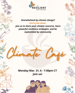 The Resilient Activist Climate Café Gatherings offer a valuable opportunity to connect with a community that gets you, fill your cup, and gain resilience insights. Our community is full of folks who are experiencing many of the emotions that climate change has brought out in your heart and mind.